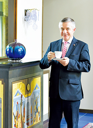 「私が好きなのは日本でも有名なザッハー・トルテ。じつは私はコーヒーの代わりにビールと一緒にいただくこともあります。甘いものと苦いもののコンビネーションを楽しむという意味で、なかなかいけますよ(笑)。私は日本に赴任して約1年ですが、日本のコーヒーのおいしさにも驚いています。カフェだけでなく、マーケットに出店していた移動販売式のコーヒー屋さんで買ったこともあり、それもとても美味しかった。2019年には日本とオーストリアの外交関係開設150周年という記念の年を迎えます。今後も両国の友好関係が続いていくように、私も努力していきたいと思います」