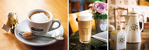 左から:ゲーテが洗礼を受けたカタリーナ教会の向かいにある〈カフェ・ハウプトヴァッヘ〉で。ゲーテのマスコットはゲーテ博物館で買い求めた物。/カフェ〈カリン〉のラテ・マキアート。/ゲーテハウスに展示された陶器。