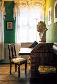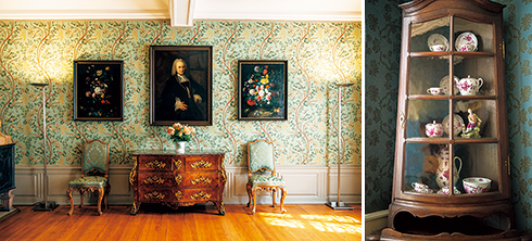 左から:ゲーテハウスの一室。家具調度も当時のまま。戦時下、岩塩採掘場の岩穴に隠して守られた。/ヘキストの陶器を納めたカップボード。ゲーテハウス1階のダイニングルームのコーナーにある。