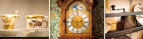 左から:ゲーテ家の裕福ぶりがうかがえる豪奢なカップ&ソーサー。/大人の背丈よりも大きな柱時計。/キッチンの棚に飾られたコーヒーミル。ゲーテもこのハンドルを回して豆を挽いただろうか?