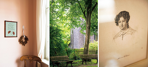 左から:「銀杏の葉」の額。/ヴィレマー夫人とゲーテの逢瀬の舞台となった館、ヴィレマーホイスヒェン。/マリアンネ・フォン・ヴィレマーの肖像画。