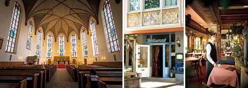 左から:カタリーナ教会の内部。ゲーテは親戚の影響で汎神論(すべてのものに神が宿るという考え)に傾倒した。一杯のコーヒーにも神は宿ると考えた?/〈ツム・シェトルヒ・アム・ドーム〉の入り口。/店のスタッフに「ゲーテがそこにいると思ってサービスしてほしい」と頼んで、コーヒーを注文した。時間を超えたコーヒーがテーブルに。