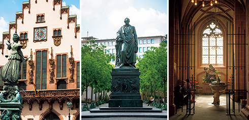 左から:レーマー(旧市庁舎)。/ゲーテプラッツに立つゲーテ像。/聖バルトロメウス大聖堂。ここで行われた神聖ローマ帝国皇帝の戴冠式の模様をゲーテは『詩と真実』に記している。戴冠式を終えたヨーゼフ2世はレーマーのバルコニーで、祝賀する群衆に応えた。
