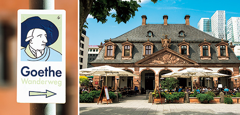 左から:この看板に沿って歩けば、フランクフルトのゲーテ関連の史跡を巡ることができる。/現在カフェになっているバロック様式のハウプトヴァッヘはゲーテの時代には帝国自由都市フランクフルトの治安を司る警備本部兼監獄だった。