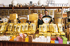 はかりの前に並べられた1キロ入りのコーヒー豆がどんどん売れていく。