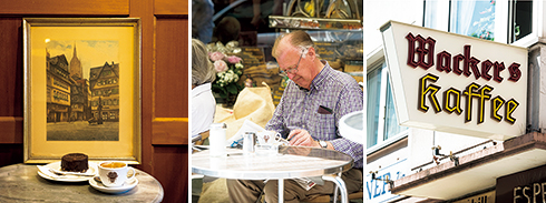 左から:レーマー広場が描かれた古い絵にザッハトルテとコーヒーを並べ、往時を偲んでみた。/ゲーテの愛したコーヒーに少しでも近づくべく、市内でも老舗の〈ヴァッカー・カフェ〉へ。創業は1914年。