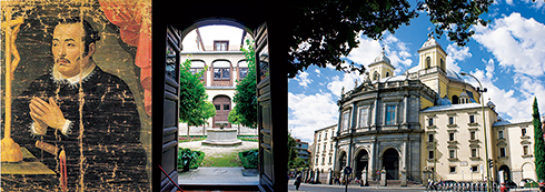 左から:十字架に祈りを捧げる支倉常長(仙台市博物館蔵)。/支倉が洗礼を受けた王立跣足女子修道院。支倉の洗礼名はフェリペ3世の名も入った「ドン・フィリッポ・フランシスコ・ハセクラ」だった。/サン・フランシスコ・エル・グランデ教会の外観。