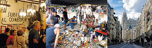 左から:セントロ地区のバル、メソン・エル・ラコン。コーヒーはともかく、支倉たちがこの町でワインを飲んだことは間違いない。/蚤の市には古いコーヒーカップも。/グラン・ビア通り。
