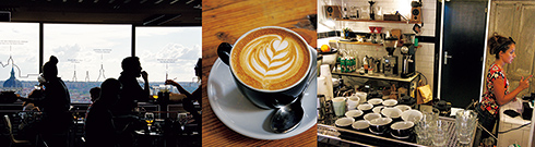 左から:百貨店エル・コルテ・イングレス最上階のグルメ・エキスペリエンス。マドリードの町を眺めながらコーヒーが楽しめる。/トマ・カフェのカプチーノ。カプチーノの名前の由来はカトリックの一派カプチン会の僧の着る修道衣との説がある。/同店のサービスカウンター。
