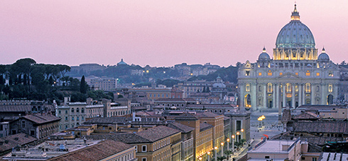 ローマの街から見えるサン・ピエトロ大聖堂。直径42mのクーポラが空に映える。その上に小さく見える球はブロンズ製で2トン以上の重さがある。クーポラの内部にはローマ市内を一望できるテラスもあり、上っていくことができる。前任者の時代から始まった工事が、クレメンス8世の統治時代に完成した。