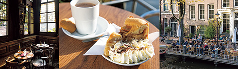 左から:茶色く煤けた内装がアンティークな趣のブラウンカフェの店内。ステンドグラスなどのディテールに、長い歴史を垣間見ることができる。/山盛りのホイップクリームを添えたアップルタルトはオランダのカフェの定番。/オランダ人はテラスが大好き。水辺のテラスが自慢のカフェもある。