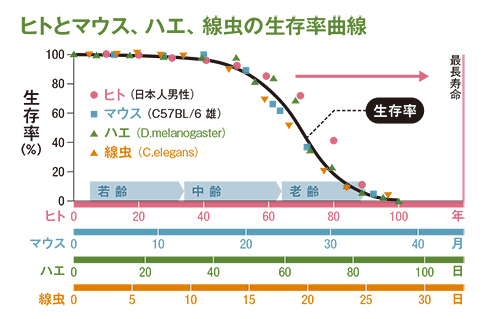 最長寿命は、ヒト120歳、マウス40カ月、ハエ100日、線虫30日と差はあるけれど、生存率曲線はほぼ変わらない。生活・環境要因を最善の状態に保ち、曲線を最長寿命へ近づけることを研究者たちは目指している。(石神昭人さん提供資料)
