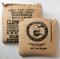 通常生豆用袋は60kg入りだが、「豆は少量ずつ、丁寧に手渡すべき」との考えから、容量11.4kgのオリジナル袋を製作。ラ・カフェオテックのロゴをあしらい、仕入れはすべてこの袋で行う。