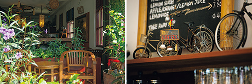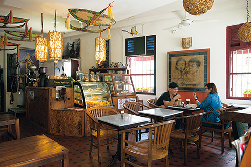このカフェが入る元建築事務所だった建物(ジョージタウンのカフェはほとんどが「元○○だった建物」に入っている)は、間口は狭いが天井が高いので、ゆったりとした印象がある。カウンターの奥は中庭を挟んで表通りに面した塗料屋さんのオフィスにつながっている。京都の町家を思わせるような作りだ。実はこのカフェの大家でもある塗料屋さんの経営者は、前ページでも紹介したリトアニア人壁画作家、ザカレヴィックのペナンでの活動を支援し、アトリエ(カフェの上階部分)も提供している人。店内でザカレヴィックさんの作品が見られるのはもちろん、運がよければ、制作の手を休めてコーヒーを飲みに降りてくる画家本人に会えるかも。