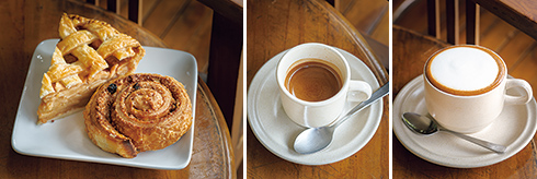 左から:シナモンロール(手前、RM7)とアップルパイ(奥、RM14)。いずれもホームメイド。/エスプレッソ・ダブル(RM6.80)。/ラテ(RM8.80)。ティグンさんはコーヒーの味わいをマイルドにするため、水は専用の装置で軟水化したものを使っている。