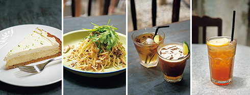 左から:キーライムパイ(RM11)。/サバとルッコラのパスタ(RM24.90)。フードメニューはパレオ・ダイエット(旧石器時代の食事に戻ることを理想とする食事理論)に基づいたもの。/ブラックトニック(手前)とレッドトニック(奥)はペナン進出を機に商品化。/ペナン島名産のナツメグの果肉を使ったジュース。