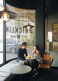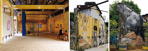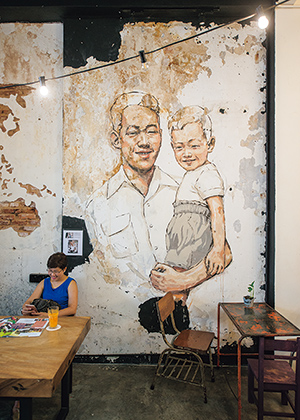 旧バス停留所の広大な敷地とアールデコ調の建物をリサイクルして2014年11月にオープンしたギャラリー〈ヒン・バス・デポー〉。その入り口に併設されたカフェが〈ブリックリン・カフェ&バー〉。煉瓦がむき出しになったオリジナルの壁を生かし、黒を随所に用いたシックな内装に大きなガラス窓から自然光がたっぷりと入る。ダークグレーのテーブルにエスプレッソ・ドリンクの褐色が映えて美しい。裏手の窓の外に目を転じると、野天になったスペースに壁画やインスタレーション作品が点在する。最大の見所は、なんといってもペナン壁画アート・シーンを代表する作家、アーネスト・ザカレヴィックの作品群だ。