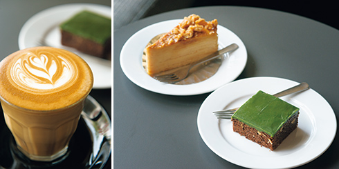 左:ピッコロ・ラテ(RM10)。/右:ウォールナッツ・グリーンティー・ブラウニー(手前、RM5)とアーモンド・ソルテッド・キャラメル・ケーキ(奥、RM13)。