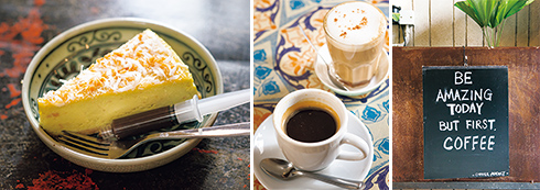 左から:マレーシア特産、パンダンのケーキ(RM16)。注射器に入った黒糖をかけて。/アメリカーノ(手前、RM7)とカプチーノ(奥、RM10)。/「今日を素晴らしい1日に。でも、まずはコーヒーを」と記されたボード。