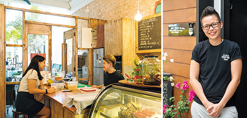 左:カウンター席では会話もはずむ。ランチのセットメニュー(サンドイッチやパスタに飲み物が付いてRM20)も人気。/右:共同経営者のジャスティンさん。