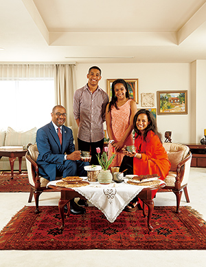 ジャマイカのアートが並ぶ大使公邸のリビングルームで、大使夫人のお手製のお菓子を囲み、お子様方も交えてくつろぐご一家。皆さん、笑顔がとてもチャーミング。