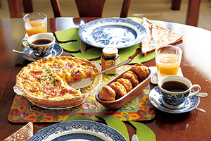 朝はコーヒーにスコーン、そしてチーズやハム入りの「アキー・キッシュ」。アキーは西アフリカ由来のジャマイカの代表的果物。