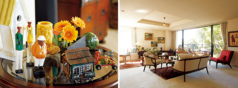 左:素朴な陶器の人形が並ぶ。/右:都心にあることを忘れそうになるリビングルーム。窓の外の大きなスギの木にいつも鳥たちが集まってくる。