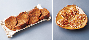 コーヒーに合わせるお菓子は、バナナブレッド(左)やココナッツタルト(右)。どちらもフルーツが豊富なジャマイカならではの焼き菓子で、朝から気軽に作る家庭も多いという。