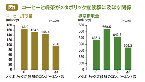 結果は、緑茶が飲用量とコンポーネント数に関係性が見られないのに対して、コーヒーは毎日多く飲んでいる人ほどメタボリック症候群のコンポーネント数が少ないことがわかった。つまりコンポーネント数が「0」の人を頂点に、コンポーネント数が多くなるにつれてコーヒーの飲用量は少なくなる。