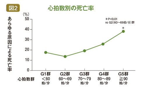 「もっとも長生きするのは心拍数60~69の人たちでした。60未満でも死亡率は少し高いですね。そして70以上になると心拍数の多い人ほど死亡率が高いことがわかります。1回だけの検診にもかかわらず、これほどはっきりとした傾向が出たのです」