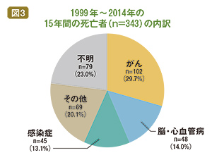 そこで1999年から2014年の年末までの15年間で亡くなった343人を調べた。図3は死亡理由の内訳だ。がんが102人でもっとも多く、次に脳の病気と心血管(心臓の血管)病が48人。そして感染症が45人、その他が69人、不明が79人。死因不明が多いのは、追跡調査の間隔が空いたため。近年は毎年調査するようにしている。