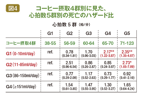 今回は死亡者の母数が小さいため、死因にかかわらず「総死亡」として、心拍数も含めて解析を行なった。心拍数についてまとめたのが図4だ。赤文字部分を見てほしい。心拍数の多い人ほどコーヒーの摂取量が少ない(G1、G2)という結果が出ている。
