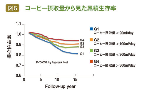 そして、図5はコーヒー摂取量から見た累積生存率だ。1日あたりのコーヒー飲用量を「20ml未満」「100ml未満」「300ml未満」「300ml以上」の4群に分けて、年齢や性別、エネルギー摂取量、飲酒、喫煙などを補正して多変量解析を行なうと、年齢を重ねるごとに「コーヒーの飲む量によって生存率に差が出ている」ことがわかった。