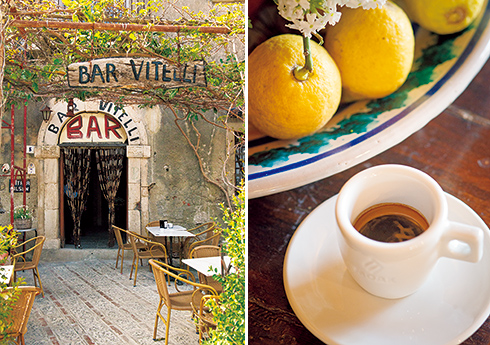 左から:アル・パチーノ演じるマイケルが出会ったばかりの村の娘に求婚するシーンで登場するバール。タオルミーナの近くのサヴォカという村に健在である。/サヴォカ村のバール・ヴィテッリにて。村は「イタリアの美しい村」にも選ばれている。