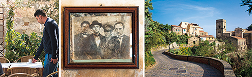 左から:まさにアル・パチーノが座っていた席。/バールに飾られていた、『ゴッドファーザー』の登場人物を描いた線画。映画の撮影から40年以上が経った。/山の中にあるサヴォカ村は人口1600人ほど。この石畳の道の先にマイケルの婚礼のシーンに使われた教会がある。