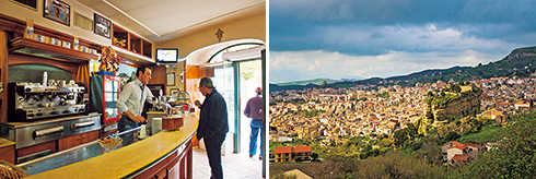 左から:今もレトロな雰囲気を残すバール・ナシェ。寡黙なコルレオーネの男たちが、午後の憩いを一杯のコーヒーに求めてやってくる。/公園で出会った老人の勧めに従って丘に登ると、コルレオーネの町が一望できた。町は海抜500メートルほどの高地に広がっている。