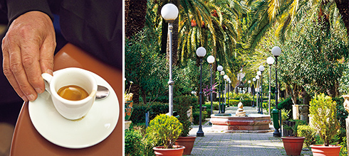 左から:コーヒーは地元のロースターが焙煎したもの。/町の中心にある公園。椰子の木がいかにもシチリアらしい。