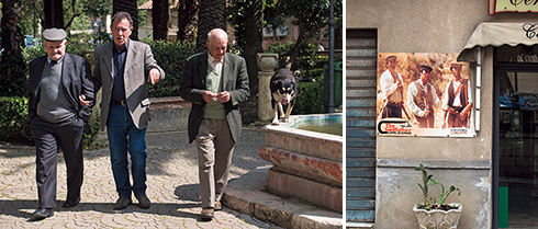 左から:コルレオーネの男たち。アル・パチーノの母方の祖父がこの町の出身。/街角で見つけた『ゴッドファーザー』のポスター。この町でロケは行われなかったが、映画のファンにとっては”巡礼”すべき場所である。