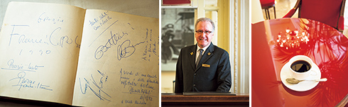 左:店に残るコッポラ監督とアル・パチーノのサイン。/右2枚:グランド・ホテル・エ・デ・パルメは撮影クルーの多くが宿泊。「タリア・シャイアがよく歌っていました」と古参スタッフのドメニコさん。