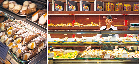 左から:リコッタチーズに甘味を加えて作るカンノーロはシチリアを代表するスイーツ。/プリンチペ・ディ・ベルモンテ通りにある1860年創業の菓子舗スピンナート。