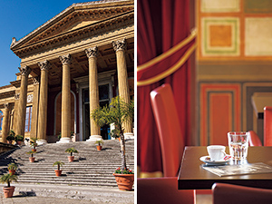 左から:クライマックスシーンが撮影された劇場正面の石段。/劇場内にあるカフェ・デル・テアトロでコーヒーを。