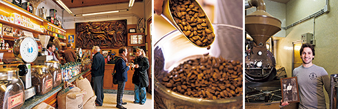 左から:地元の常連客。/ニカラグア、ホンジュラス、ブラジルなどの豆でオリジナルブレンド数種を手がける。/イデアル焙煎所の四代目ジャンフランコさん。手に持っているのは創業者ジョヴァンニさんの写真。