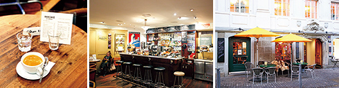 左から:昔ながらのスイスのおもてなしを大切にする、レネさんのカフェ。コーヒーの横には必ず水を添えて。/歴史を感じる店内。劇場横のカフェにはいつも役者や作家、パフォーマーなどの文化人が集まる。/チューリッヒの冬は長くてとても寒いが、最近は冬もテラスでコーヒーを楽しむ習慣が。