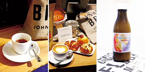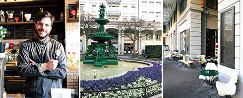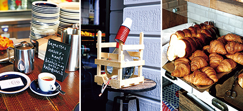 左から:人気はやはりエスプレッソ。その他、コーヒーメニューは10種類以上が揃う。/カフェの外には自由に飲める水が置かれている。水も有料のスイスでは貴重なサービスだ。/パンも人気。素材を厳選し、特注で焼いてもらっている。