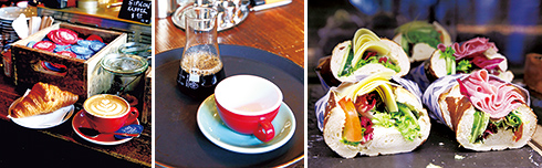 左から:朝訪れる常連客に人気の組み合わせ。カプチーノ(5.5CHF)、クロワッサン(1.9CHF)。/5分もかけてていねいにいれるアメリカンコーヒー(5.5CHF)。/パニーノ各種(7CHF)。その他、カフェで手作りするタルトやケーキ、フレッシュジュースなども美味しい。