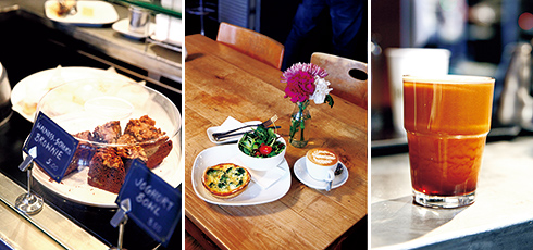 左から:ケーキは5~8種。ブラウニーやチーズケーキもありアメリカを感じさせる。/キッシュ(9CHF)やサラダ(6.5CHF)も。/16時間かけて水出ししたNitro Cold Brew(7CHF)。香り高く甘みがあり、シルキーでクリーミーな口当たり。
