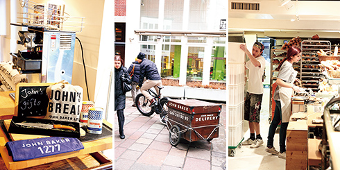 左から:パンを保存するための麻袋やコットンエコバッグ、まな板とナイフなど、オリジナルグッズも販売している。/配達は自転車でエコロジカルに。/パンとコーヒーを売るそのすぐ奥で、パンが次々と焼き上がる。パンを買うついでに人気のコーヒーをさっと1杯、その場で楽しむお客が多い。