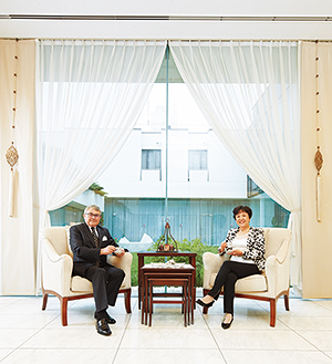 鮮やかな芝生の庭に面した大使公邸の広間にて。夫婦は時間があると一緒に散歩を楽しむ。コーヒーブレイクをはさんで2~3時間歩くことも珍しくないのだとか。