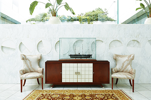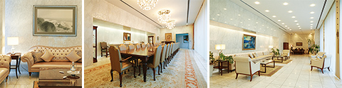 (上と下左)1890年、トルコの軍艦エルトゥールル号が和歌山県の串本沖で沈没した際に地元住民が乗組員69人の命を救った「エルトゥールル号遭難事件」は、両国の絆を深めるきっかけとなった。公邸内には船の模型や串本の海を描いた絵が飾られている。(下右と中)晩餐会やレセプションが行われる公邸内のスペース。