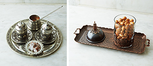 左:コーヒーを煮立てる小鍋(写真上部)は「ジェズヴェ」と呼ばれる。トルコの伝統的なお菓子「ロクム」(写真下部)はもちもちした食感でコーヒーのお供に欠かせない。/右:トルココーヒーは苦めなので、必ず水と甘いお菓子とともに出される。アーモンドを砂糖でコーティングしたアーモンドキャンディも定番のお菓子の一つだ。